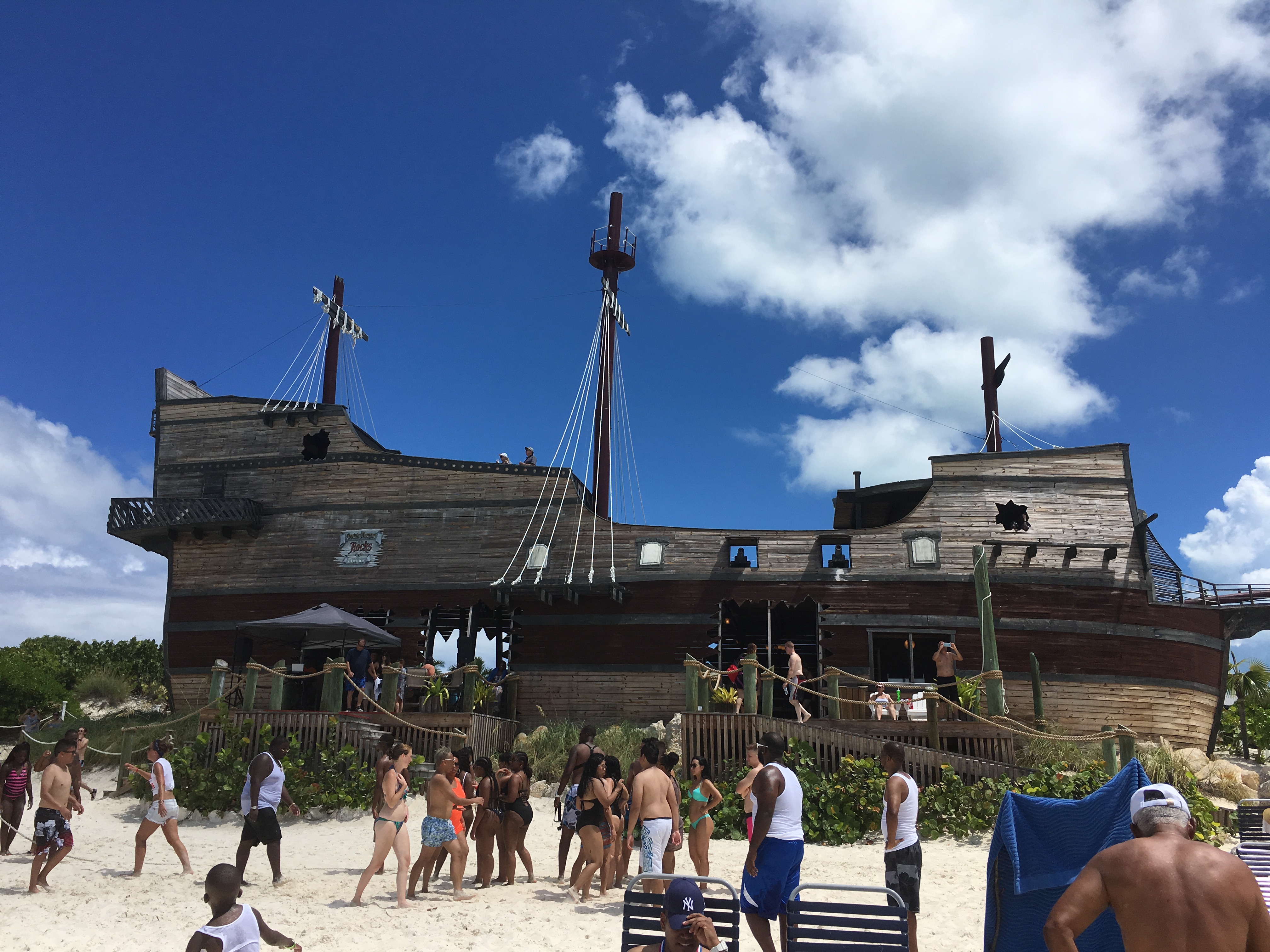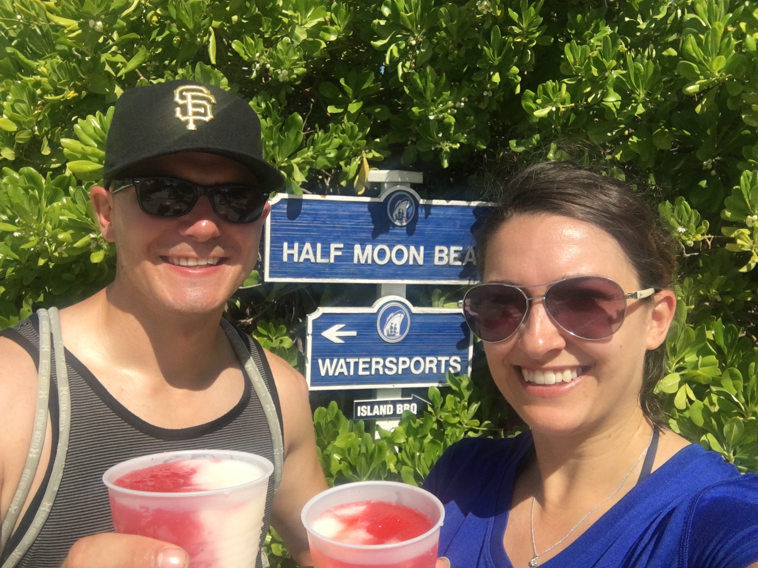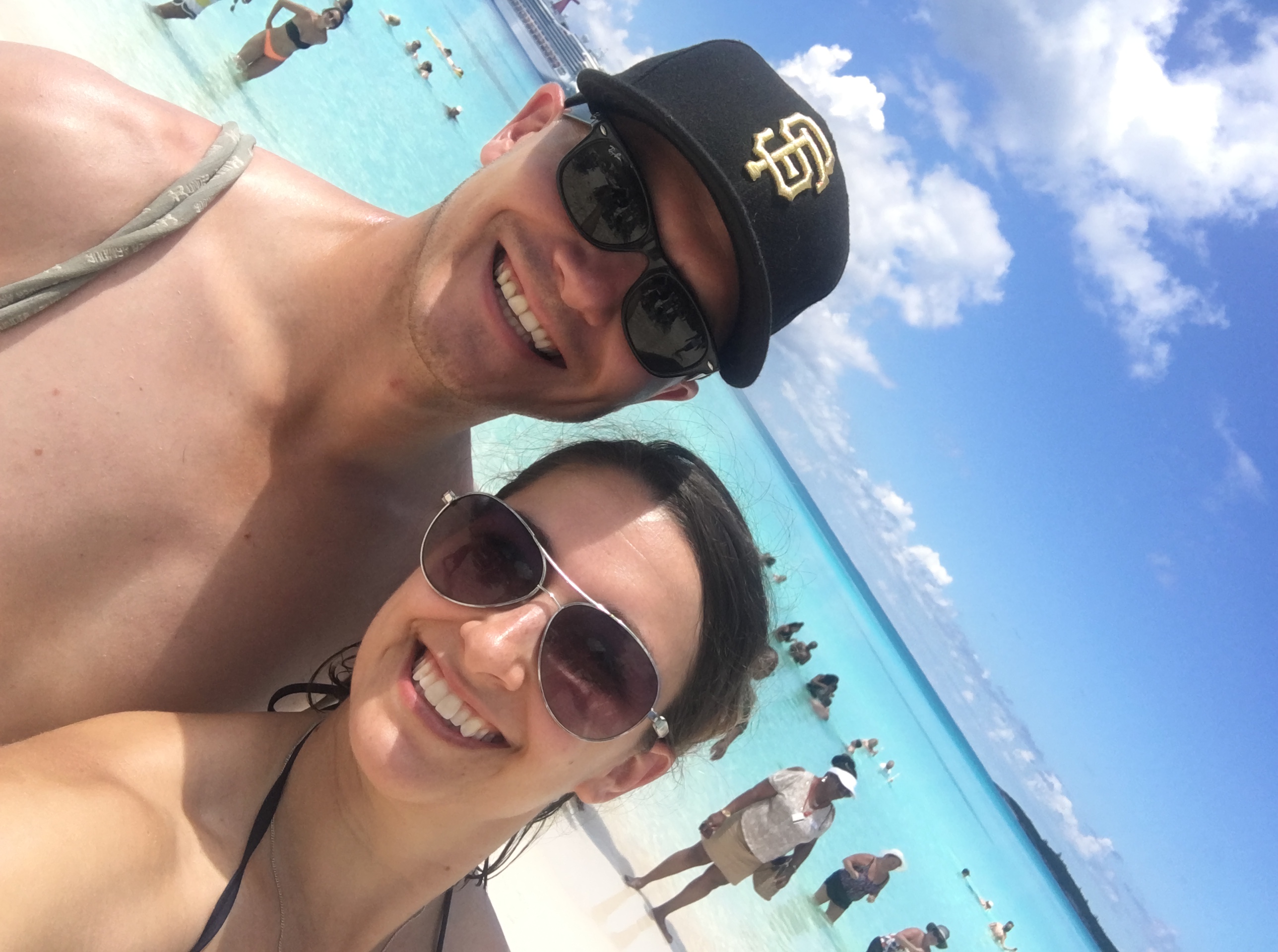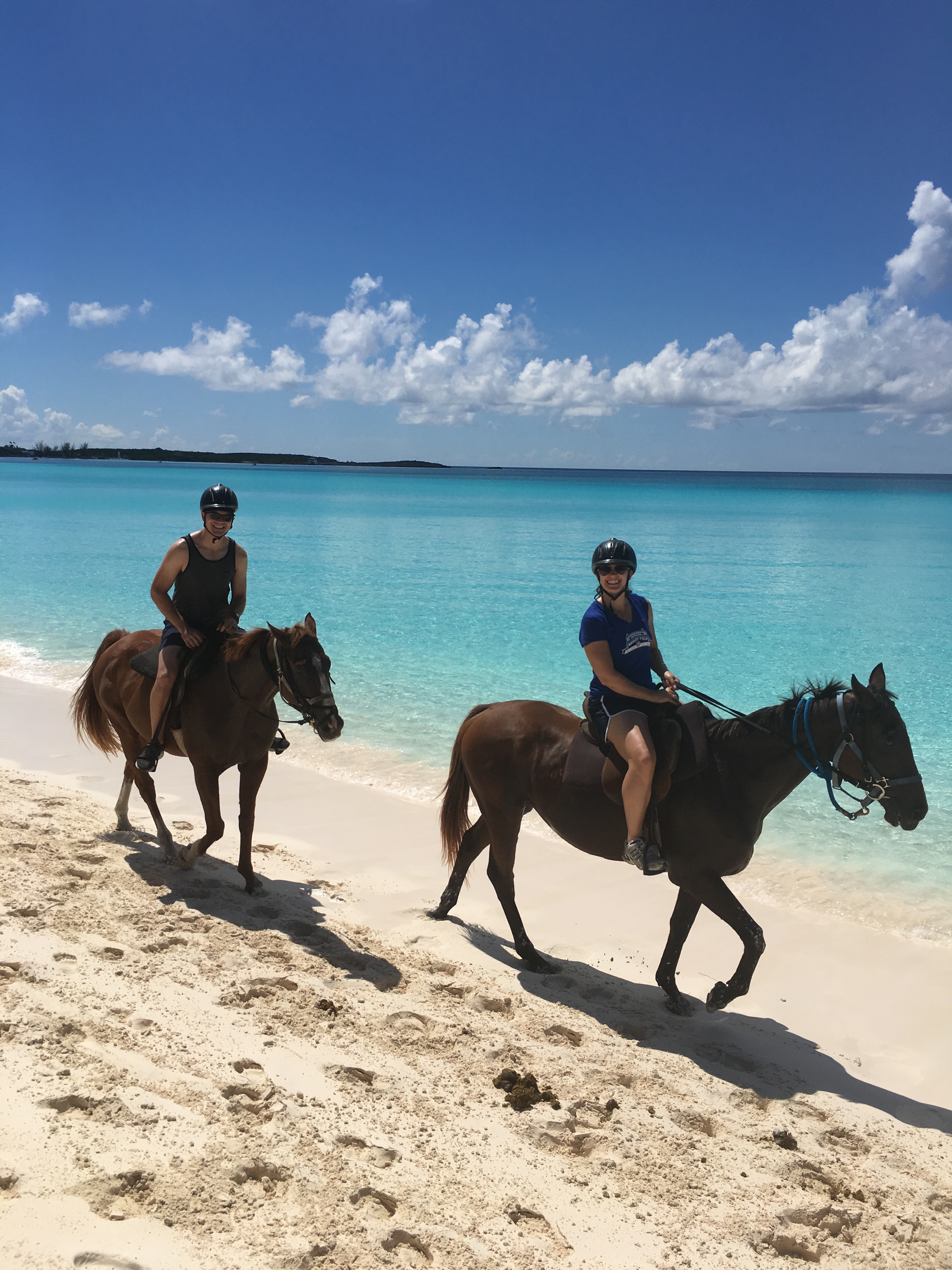 Our first stop on the cruise was to Half Moon Cay in the Bahamas. As we sailed into the island, the water and horizon were stunning! Gorgeous aquas turned into deeper blues and contrasted with the beautiful white sand. We tendered to the island and disembarked into a small “port” town set up with shops and bars owned by Carnival. With a couple Miami Vice drinks in hand (half Pina Colada, half Strawberry Daiquiri), we wandered around the local shops and checked into our excursion– horseback riding on the shore! This has always been on my bucket list, so I was more than excited.  A little while later, about 15 of us climbed aboard an open-air safari truck and headed towards the far end of the island to the horse stables. Once we grabbed our helmets, we were assigned horses and I lucked out with a beautiful black horse named Pride while Rob saddled up on Reggae. After trotting around the stable for a warm up, we toured the island and passed green acres filled with goats, trails and palm trees. We headed back towards the beach and Pride rode me threw the shallow waters and Reggae followed close behind– which made it easy to get good selfies of us together! After a bit, we took the horses back to the stables and grabbed some water for ourselves (and them!) before switching horses and taking them for a swim in the ocean. It was amazing and I’m pretty sure I had a smile plastered to my face the entire time 🙂 Although it was a little more romantic in my head, it was hilarious and utterly realistic that my new horse decided to relieve himself (if ya know what I mean!) on the way back to shore. I mean, life happens!