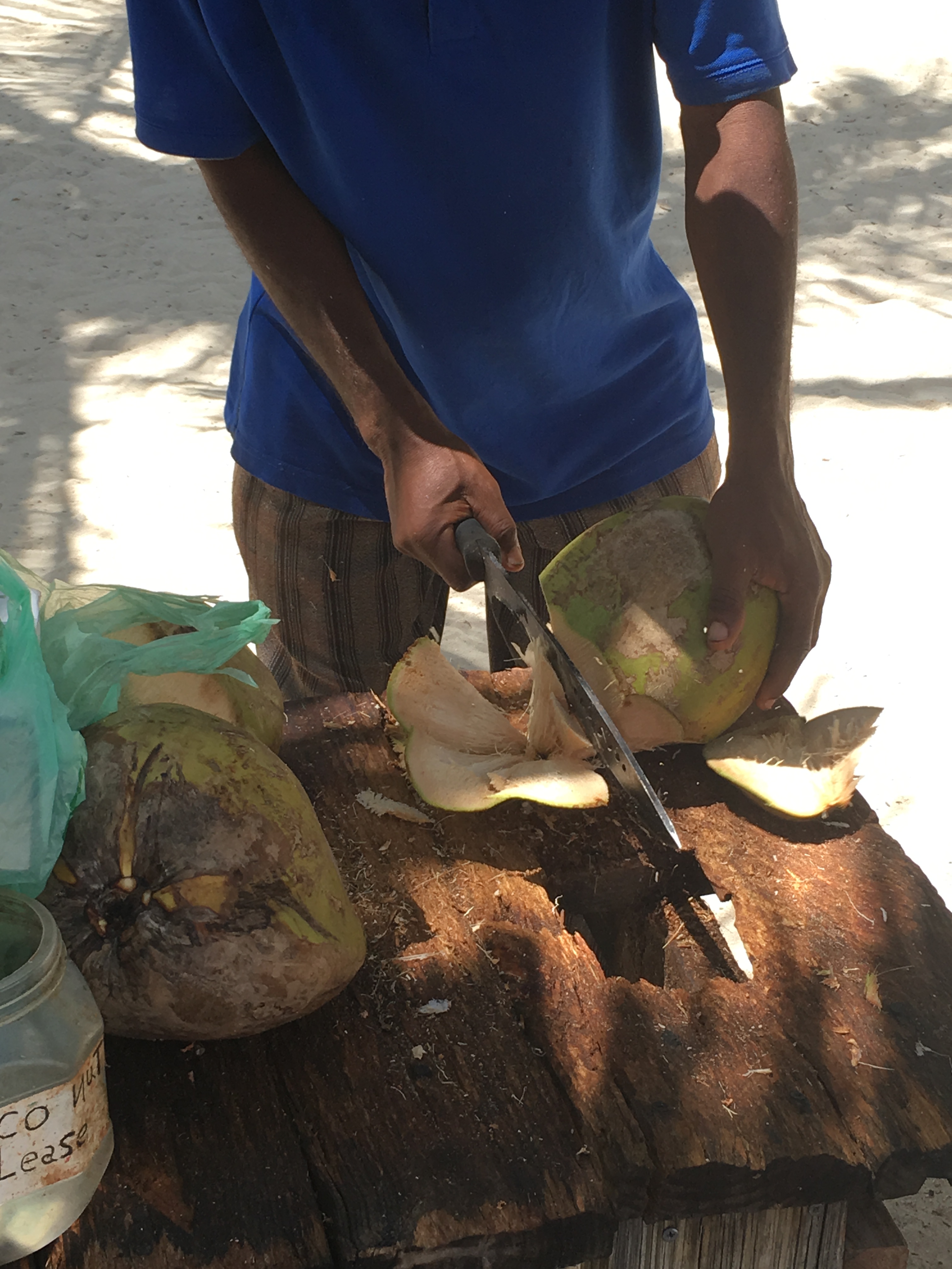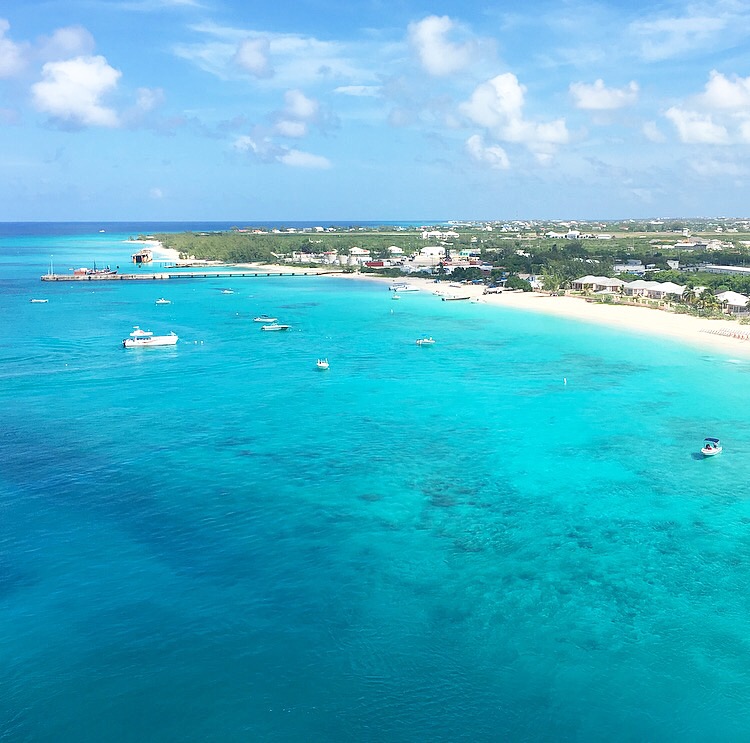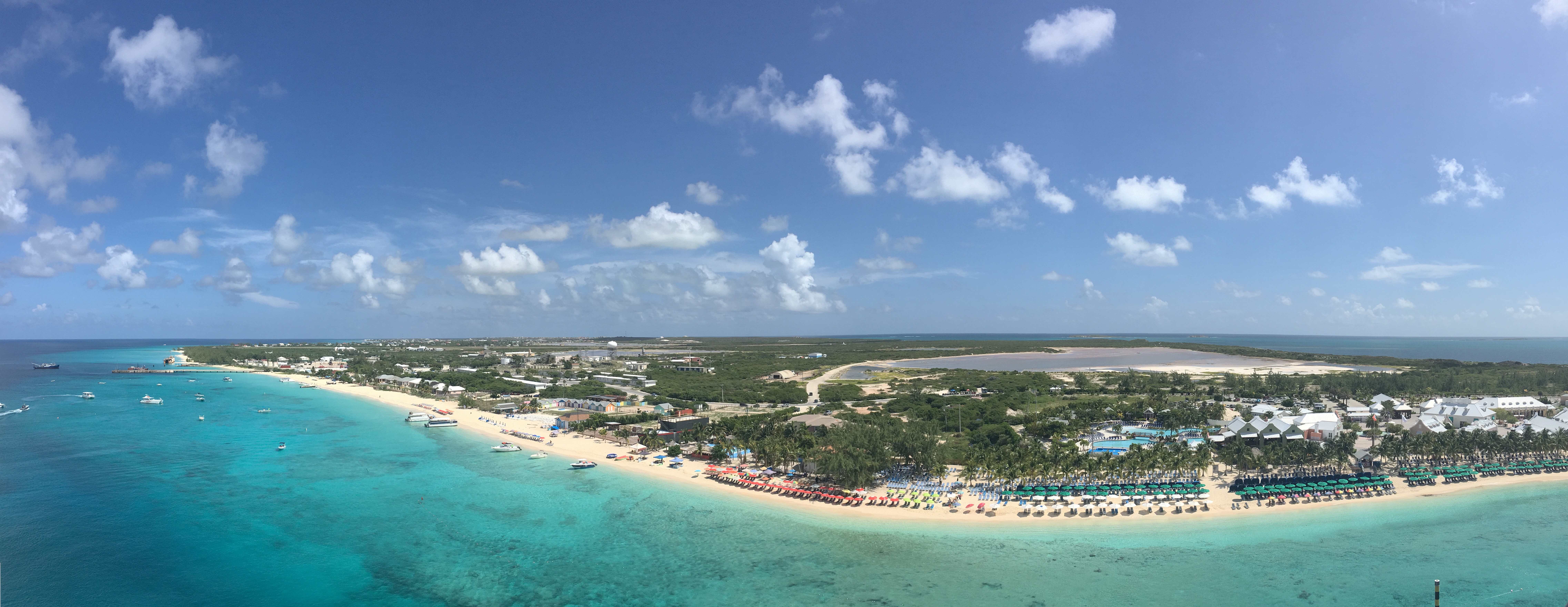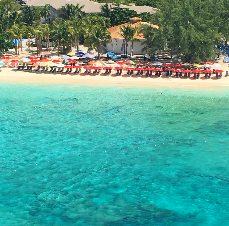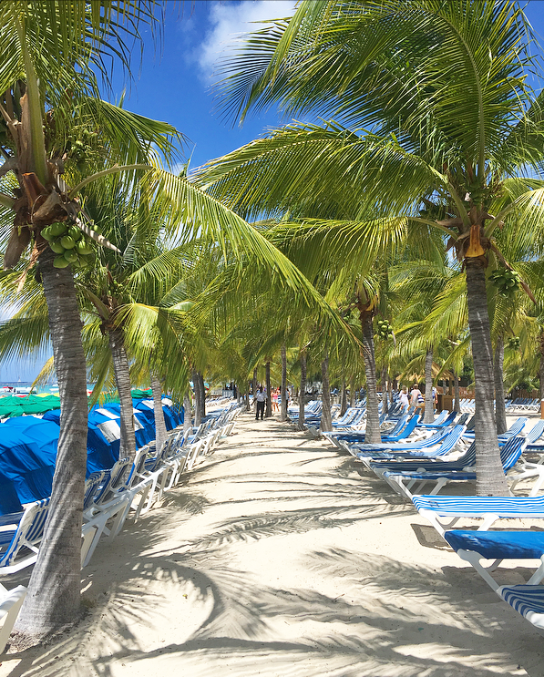 With Turks and Caicos on my bucket list, I was super excited to go. We didn’t book an excursion here either, but chose to soak up the sun and sand and do a little more snorkeling. As we sailed into port, we could see around the entire island– so much smaller than we imagined, but the view was unbelievable! The water is stunning and the beaches are soft and white. There’s a bit more to do on this island than Half Moon Cay, like visit the lighthouse at the far end, but otherwise, you’re kicking back and enjoying the gorgeous beaches and clear blue waters. As we walked down the shore, we found local beer stands with amazing smelling food next to beach volleyball courts and umbrella-ed patio tables. The chaise lounges and umbrellas lined up on the beach were perfectly situated among the palm trees with super fine, white sand. Besides testing out the local Turks Head beer, we hydrated with a good-old island coconut carved up with a machete!