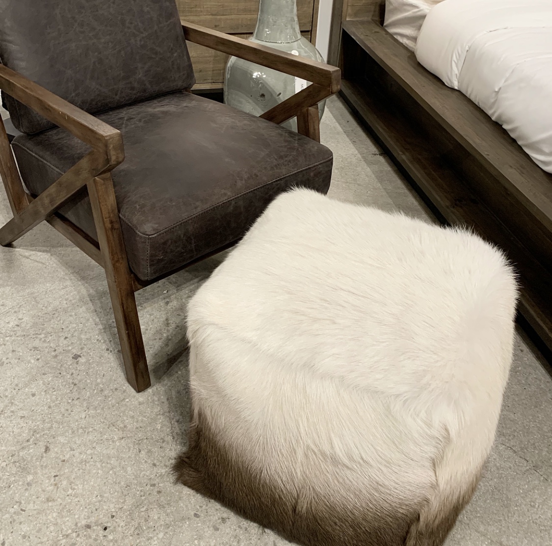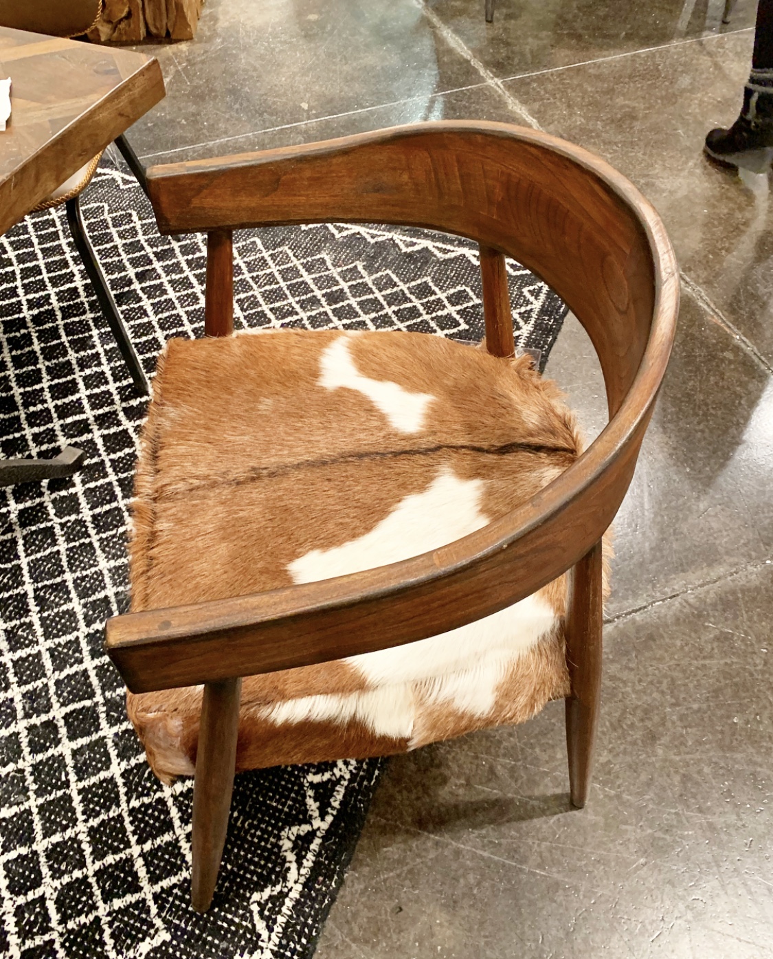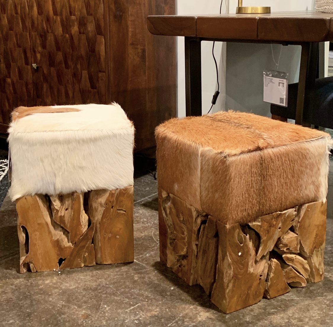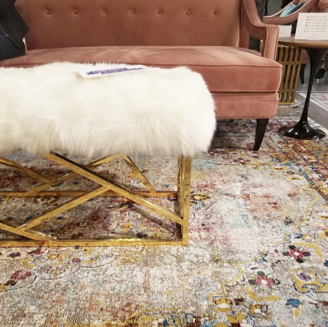 Furry white ottoman? Check. Furry bench? Check. Furry pillows. Double check. And in so many colors! Let’s just say there wasn’t a shortage of fur. There were blankets, rugs and chairs too. We love these as accents to cozy up a room! The hides we found were gorgeous too! Whites, cognacs, blacks, and everything in between. I’ve always been a sucker for hide rugs and ottomans and loved seeing new takes on one of my faves! Chairs and contrast ottomans mixed with wood or polished with a metal base.