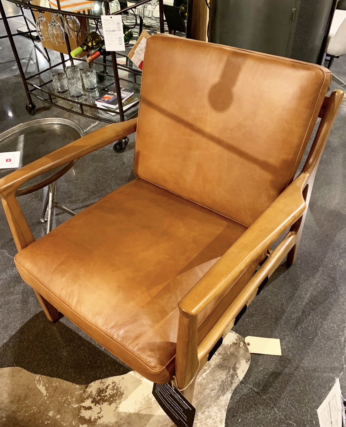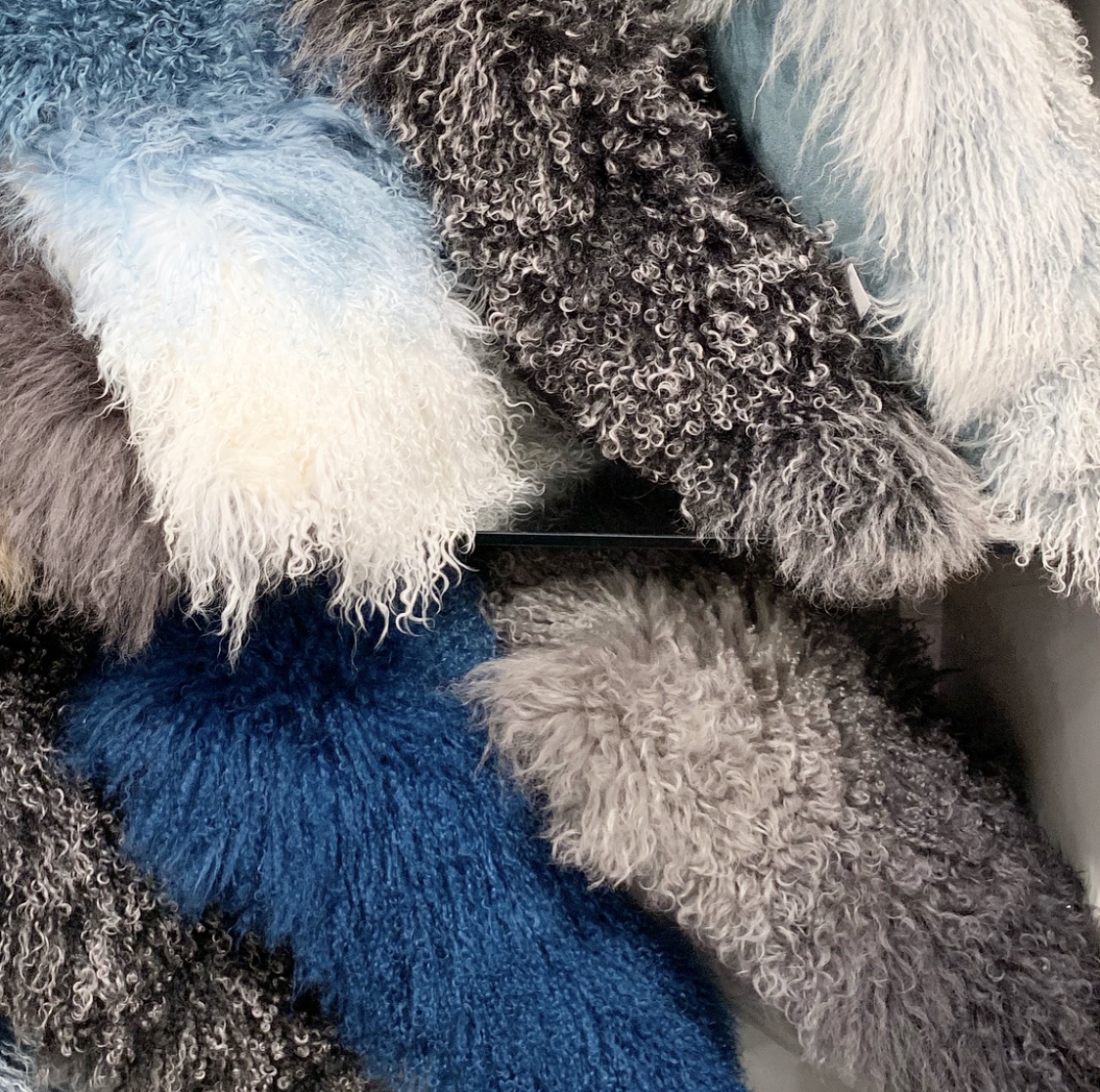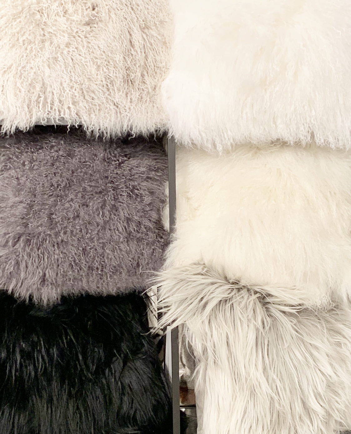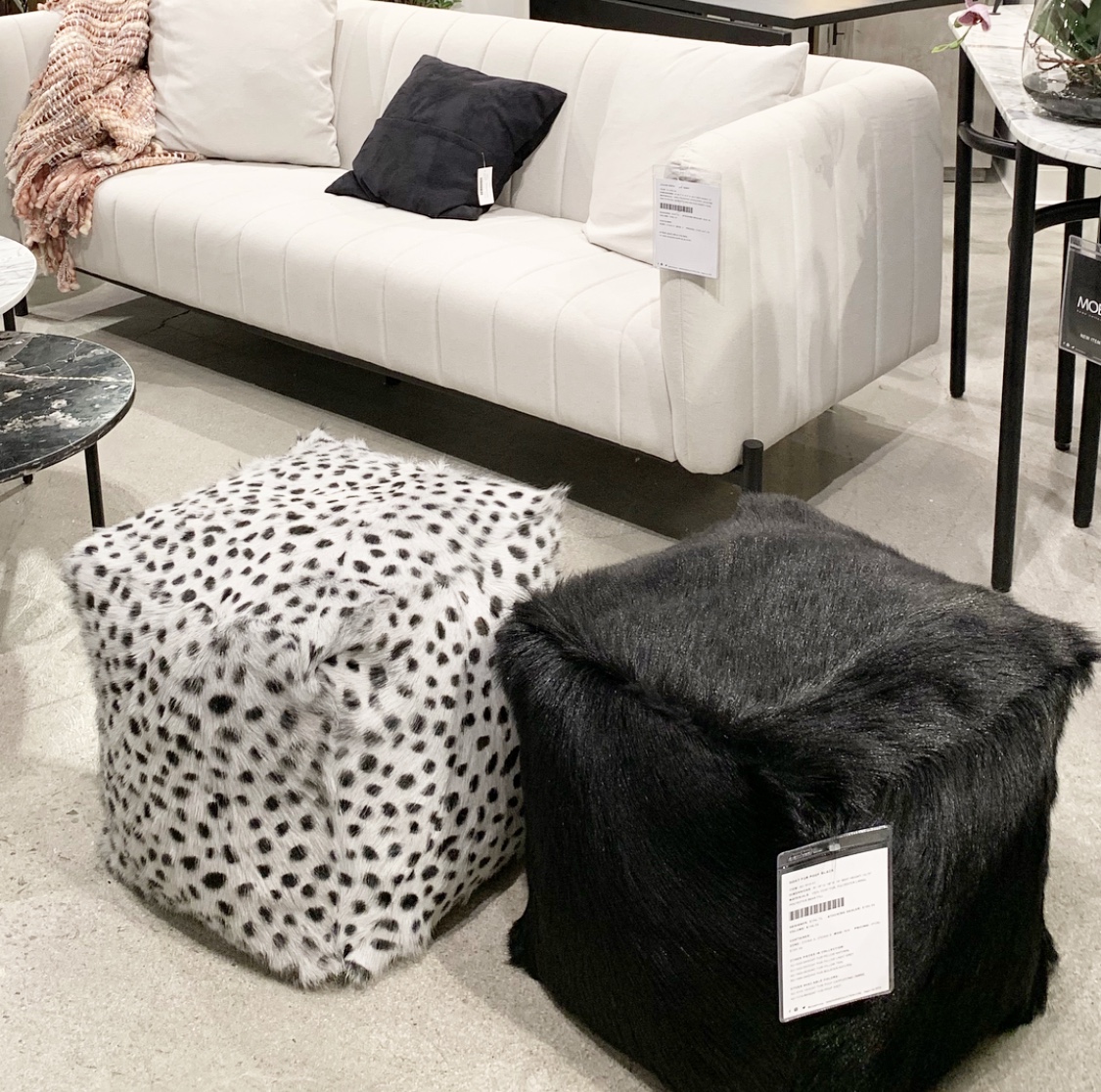 Furry white ottoman? Check. Furry bench? Check. Furry pillows. Double check. And in so many colors! Let’s just say there wasn’t a shortage of fur. There were blankets, rugs and chairs too. We love these as accents to cozy up a room! The hides we found were gorgeous too! Whites, cognacs, blacks, and everything in between. I’ve always been a sucker for hide rugs and ottomans and loved seeing new takes on one of my faves! Chairs and contrast ottomans mixed with wood or polished with a metal base.