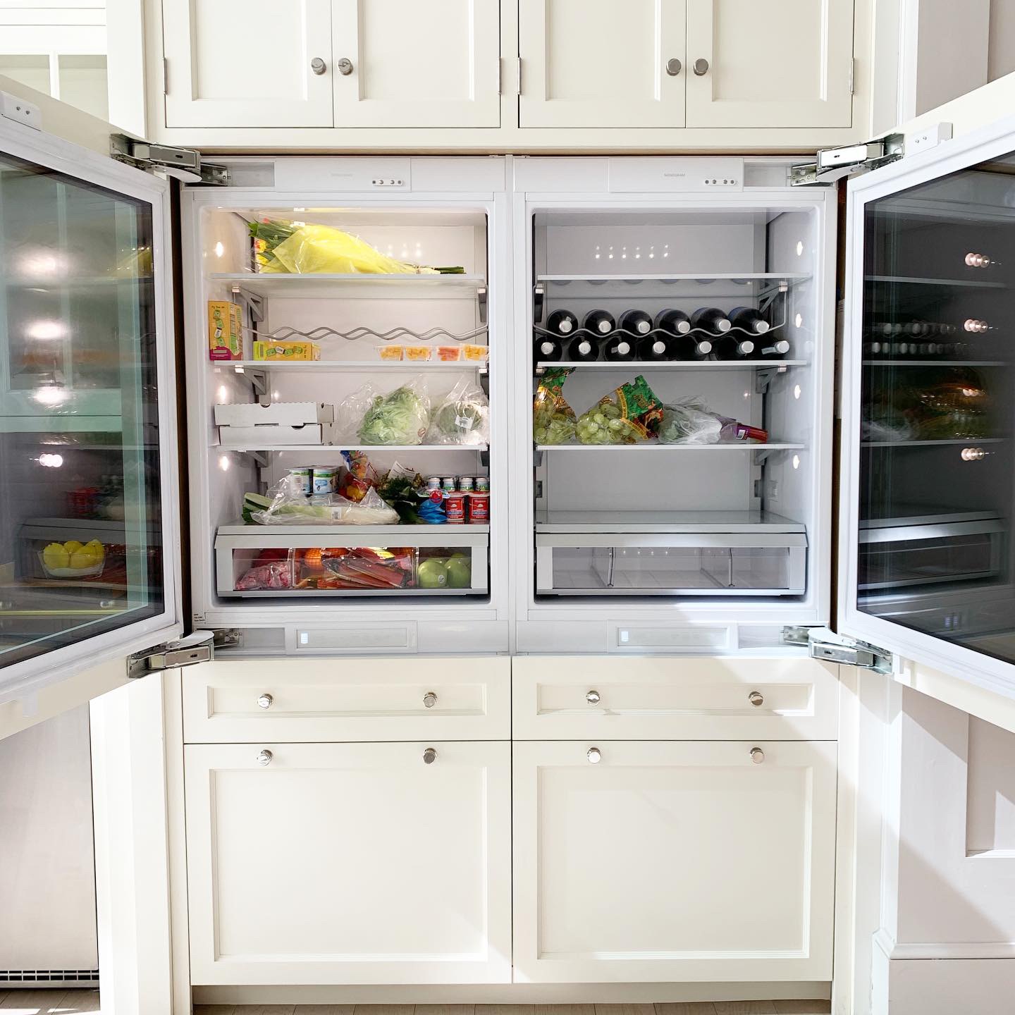 When it comes to the fridge, personal preference takes the cake with options including French Door, bottom freezer, side-by-side, counter depth, and column styles in stainless, glass door or paneled. There are so many to choose from and the Design Center had several full working kitchens with them all on display. I immediately fell in love with the Monogram 30″ Fully Integrated Customizable Refrigerator. With a dual-refrigeration system, it provides precise and customizable climate control with three independent temperature-management zones- the top for refrigeration, the middle for an ice maker and freezer compartment, and the bottom which converts between refrigeration, freezer, or wine and beverage storage. Beautifully lit with side LED lighting, it is attractive and energy efficient, while the adjustable shelving, soft-close drawers and availability in stainless steel, glass door, or fully customizable panels made for one happy group of designers! And when you put TWO side by side like the one below, you’ve just found my dream fridge!